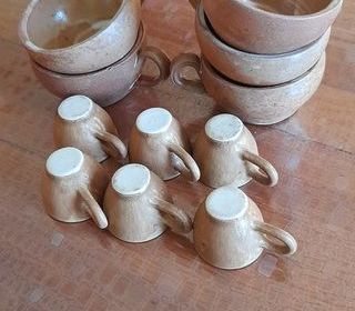 Cinq tasses à café + 6 petit verres à liqueur, en gré.