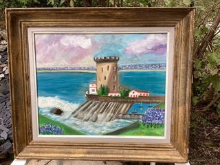 Tableau encadré représentant un paysage côtier avec une tour et des maisons, peinture réalisée sur toile, cadre en bois doré, en bon état général.sur toile , peinture à l'huile, s