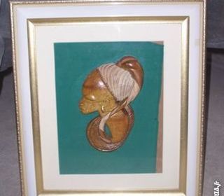 beau tableau sous verre avec tête en relief collée sur le verre, sculptée en bois exotiquede différentes couleur. Faire offre