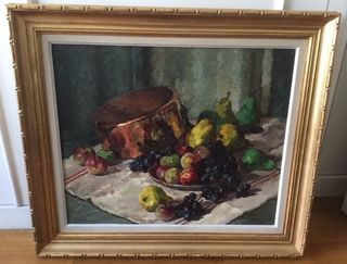 Signé Adeline Hugonnard (St Etienne 1906 / Chauffailles 1985) Huile sur toile Nature morte aux fruits et chaudron de cuivre Dim hors tout 81 X 71 cms Dim toile / vue 68 X 56 cms S