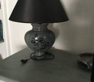 Lampe de table avec abat-jour noir et base en céramique grise ornée de motifs floraux blancs. Équipée d'un cordon d'alimentation avec prise standard.