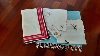 Je vends un lot avec 7 centres de table blancs(65x53) un centre de table motif branches de houx(79x79),un centre de table point de croix motif fleurs (84x84),6 serviettes de table