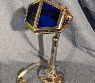 Lampe PIROUETT DE BUREAU art déco 1930 en parfait état d'usage AVEC VERRES VITRAIL BLEU. La hauteur est réglable de 30 à 50 cm environ, Abat jour orientable et pivotant sur ROTUL