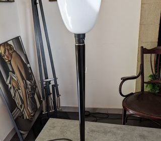 Belle lampe art déco MAZDA laquée noire avec tulipe en opaline et en bon état. D'époque art nouveau art déco vers 1930. Hauteur 78 cm diam 25 cm. Avec la douille E27 a tirette