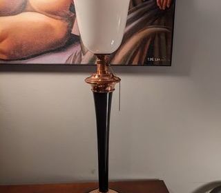 Très belle lampe art déco MAZDA 1930 CUIVRE et LAQUE NOIRE en bois massif avec sa tulipe en opaline et en parfait état. D'époque art nouveau art déco vers 1930. Hauteur 78 cm diam