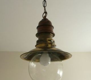 LUSTRE SUSPENSION style marin bois et laiton patiné avec globe, Très bon état, A prendre sur place