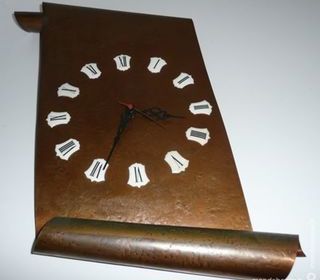 PENDULE MURALE en cuivre martelé et patiné, façon parchemin, modèle garanti fait à la main par M. DELALANDE (50) Villedieu France, Médaille d'or Paris, estampillé, hauteur 40 cm, l