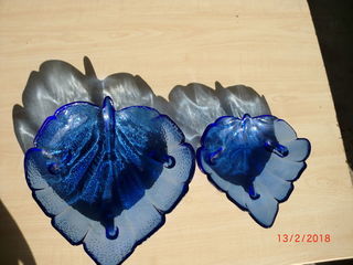 2 corbeilles en verre représentant un feuille de couleur bleu l'une d'un Ø de20 cm pour 2 euros l'autre d'un Ø 27 cm pour 3 euros ou 4 .50 euros les 2