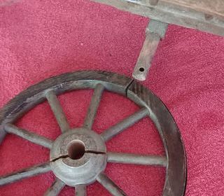 Charette en bois artisanale, date des années 40/50, en bois et métal pour le dessus des roues. Longueur 75 cm En bon état vu l'âge hormis une roue a réparer Pour déco ou jouet
