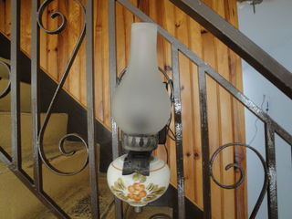 4 appliques murales sur support en fer forgé. Boule décorative en faience et globe en verre fumé