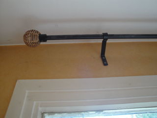 1 tringle métallique pour rideaux avec 2 supports et 2 embouts rond , ajourés. longueur 2, 50 m. bon état.