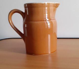 Vends une carafe en grès émaillé extérieur et intérieur ou céramique avec bec verseur, couleur marron clair, marque Digoin n°2. Hauteur : 17 cm Diamètre à l'ouverture : 10,5 cm