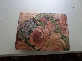 Repose-pieds ancien de style rustique, avec sa structure en bois massif et son revêtement en tissu fleuri multicolore, parfait pour ajouter une touche vintage à votre intérieur. -