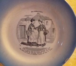 Vends 2 assiettes anciennes avec légende en vieux français. Support pour suspendre. Diamètre : 20 cm Peuvent se vendre séparément à 25 euros l'unité (elles ont été expertisées