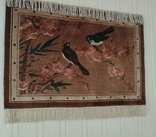 Vends un magnifique tapis en laine, à franges montrant des pies dans un cerisier du Japon en fleurs. Peut servir au sol ou en décoration murale. Dimensions : 80 cm * 92 cm Très b