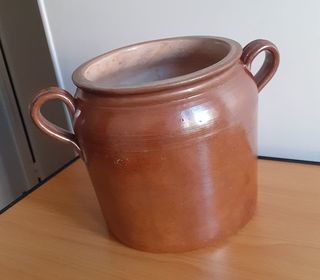 Vends un pot à graisse moyen format, avec anses et rainures sur le haut, couleur marron. Hauteur : 22 cm Diamètre le plus large : 24 cm (32 cm avec les anses).