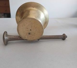 Mortier et pilon ancien en bronze massif. H 8cm diamètre haut 12cm fond 7,5cm. Pilon L 21cm. Poids 1,260 kg. Très bon état.