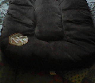 Coussin de forme ovale avec un rebord surélevé et un espace central, de couleur beige. Le coussin est posé sur un lit.Vend: Arbre a chat, 2 Modéles avec corde SISAL pour les griffe