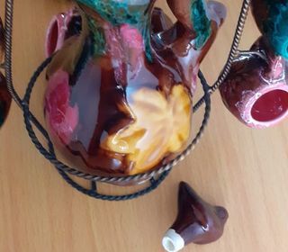Vends un service à liqueur style Vallauris comprenant une carafe avec bouchon amovible, 9 petits verres avec anse et un support en fer forgé pour accrocher les verres. Hauteur tot