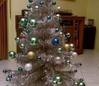 Vends un sapin de Noël avec pied avec ses décorations, couleur argenté + 1 carton de décorations gratuites. Branches repliables. Hauteur 1.40 cm - Largeur maximale 0.90 cm. Pied