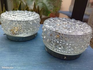 Vends un lot de plafonniers ou appliques années 70 / 80 en verre blanc ciselé. Sur socle en métal 13 cm de diamètre. Diamètre total 15 cm Hauteur totale 9 cm. Peut se vendre sép