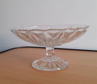 Vends une petite coupe à fruits ou à gâteaux sur pied, en verre transparent blanc, ciselé, ancienne. Hauteur : 11 cm Diamètre : 20 cm.
