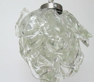 Suspension en pâte de verre d'un créateur dans le goût de Mazzega.Armature en inox et pétales ou feuilles en verre sculptées de 1a 2 cm d'épaisseur , fixées sur l'armature en cône