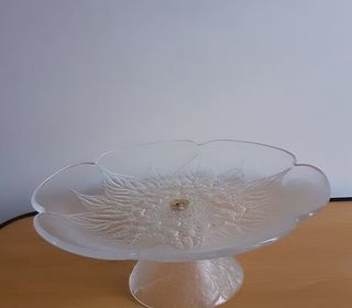 Vends une grande coupe à fruits ou à gâteaux sur pied qui se dévisse, en verre blanc transparent, en forme de grande fleur, très ancienne. Hauteur : 12 cm Diamètre : 30 cm.