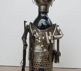 Décorez votre table avec ce porte-bouteille en métal argenté. Présentation : chasseur avec son fusil et ses jumelles. Hauteur : 33 cm. Livré sans bouteille.