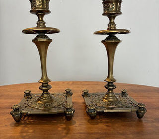 Exceptionnelle paire de bougeoirs anciens, de style néo-Renaissance victorienne du 19e siècle, fabriquée par O. Prachthauser en Allemagne, finement ciselés en laiton massif, reposa