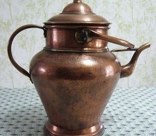 pot à anses en cuivre avec couvercle, fond laiton, hauteur du pied au couvercle : 35 cm, diamètre du fond : 16 cm, distance extrémités bec verseur à poignée : 34 cm, article très b