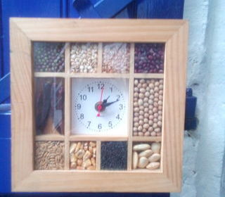 horloge décorative avec compartiments de graines et condiments, 20cmX20cm, dispo,si tjrs ann.