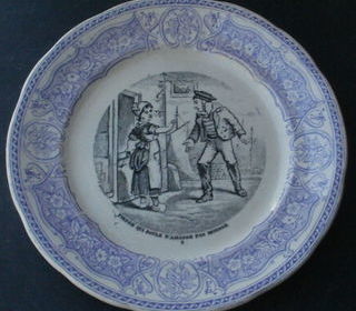 Une assiette parlante Sarreguemines. Elle présente une citation inscrite : "Pierre qui roule n'amasse pas mousse". Diamètre de l'assiette 19.5 cm. Date estimée, selon l