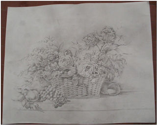 Reproduction sur papier granulé d'un dessin de Jacques VILLEMUR, qui représente un bouquet de fleurs dans un grand panier et des fruits à terre Dimensions 47 cm x 58.5 cm Sera