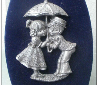 Un petit tableau de forme ovale, en étain sur du velours bleu. Il représente des enfants (une fille et un garçon), se tenant sous un parapluie. Dimensions : 10 x 17 cm.