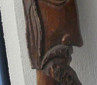 STATUE, BUSTE d'un CONQUISTADOR, sculpté dans le bois D'une hauteur de 51 cm et largeur 12.5 cm Une partie de l'intérieur a été creusée Quelques éclats Objet original Envo