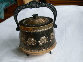 Vends boite métal de forme chaudron pouvant servir de bonbonnière, en bon état. Haut 15cm x diam 15cm poids 400gr. 4€ Contact par mail.
