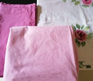 Lot de deux draps de lit en tissu, un rose uni drap housse, taies d'oreiller rose foncé uni et un blanc avec motifs floraux roses pour drap du dessus. En bon état, idéal pour usage