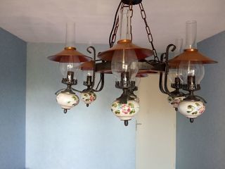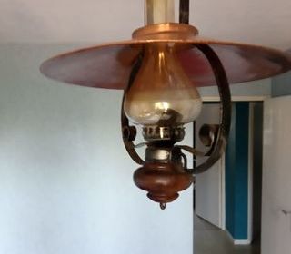 Lustre en bois verre, bois et cuivre en très bon état