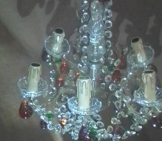Très beau lustre à pampilles en cristal colorés et laiton, modèle rare et élégant.