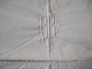 Grand drap blanc ancien (vers 1920), en métis, brodé main, avec monogramme BR d'une hauteur de 11 cm et jours échelle sur sa largeur. Aucune tache, juste un infime accroc à reprise