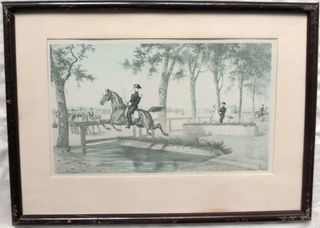 Ancienne gravure représentant une scène militaria, soldats et leurs chevaux lors d'un entrainement Signé en bas à droite Cadre baguette en bois (traces d'ancienneté, accrocs) So