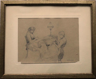 Josep Luis PELLICER FEÑÉ (1842-1901, dessin représentant une scène de couture entre femmes. Encadré sous verre. Une légère pliure et un minime manque visibles sur photos. Cadre en