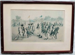 Ancienne gravure représentant une scène militaire, soldats et leurs chevaux Signé en bas à droite Cadre baguette en bois (traces d'ancienneté, accrocs) Sous verre 37 cm sur 27