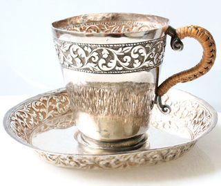Tasse à thé ou à chocolat et sa soucoupe en argent massif à décor floral L'anse de la tasse est enrobée d'une légère cape de paille pour ne pas se brûler en buvant Sous-tasse 12