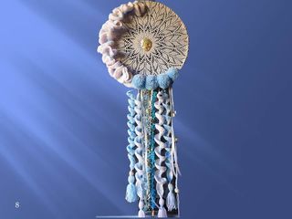 Attrape rêves fait main ossature bois, déco majorité en laine et accessoires, utilisation de napperon dentelle fait au crochet DIAMETRE: 34 LONGUEUR: 86 CM