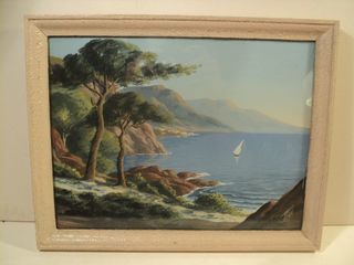 Tableau Paysage Côte d'Azur Voilier Gouache Encadrée sous Verre Signée Vers 1960. 02 Encadrement format : 38,5cm x 31cm. Gouache format à vue : 33,5cm x 25,5cm Etat : Très
