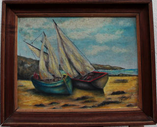 Ancienne peinture à l'huile sur panneau bois représentant 2 barques de pêcheurs sur une plage en bord de mer Sur le bateau de gauche se trouve un personnage, probablement un marin