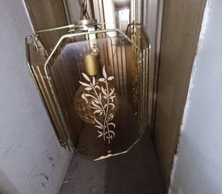 Lustre en verre fumé, avec lampe en verre blanc ciselée, donne un bel effet lumineux