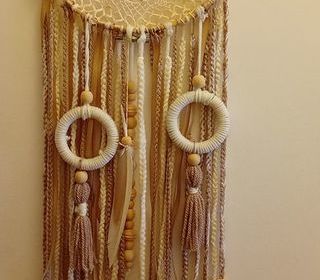 Attrape rêve fait main. Ossature bois et crochet . Dans les tons de beige et crème Largeur : 22cm Longueur : 60cm Remise en main propre Svp pas de paiement via le site mer